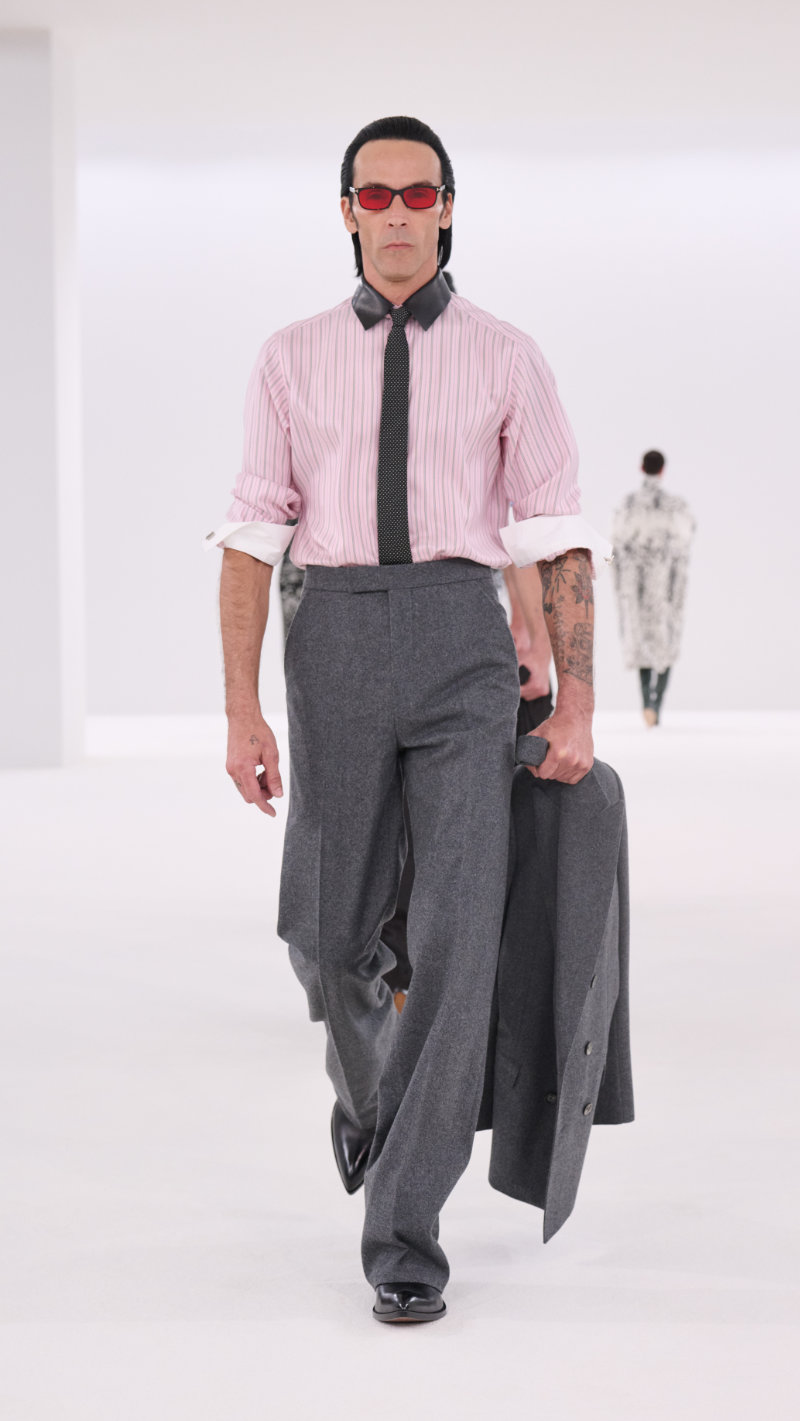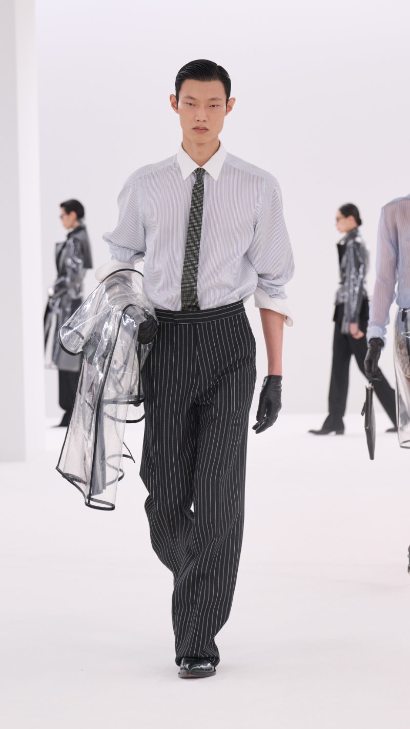 Pinstriped and micro-houndstooth suits appeared repeatedly while subtly destabilizing the rigid codes of corporate dressing as trousers sat dramatically high on the waist or slouched low on the hips, sleeves rolled up, and many shirts left open. There was also an undercurrent of experimentation running through the tailoring as Ackermann is known for his cuts, and this season sees his strongest. Favorites included transparent outerwear with plastic trenches and cropped blazers.
